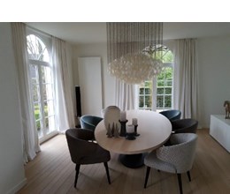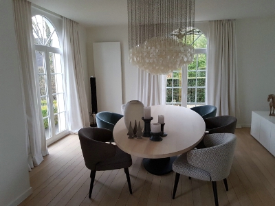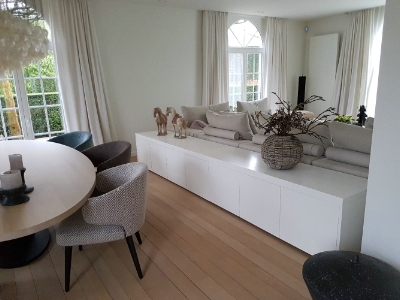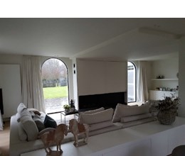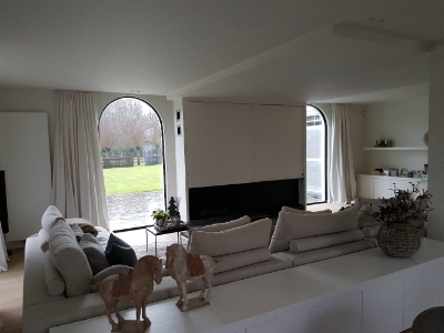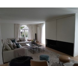 De minimalistische aanpak door in het geheel maar met 1 kleur te werken en de accenten te plaatsen door middel van de meubels, de nieuwe blikvanger met de sfeerhaard, het opfrissen van de bestaande parket en de decoratie weerspiegelen uiteindelijk het doel en wens van de klant.
